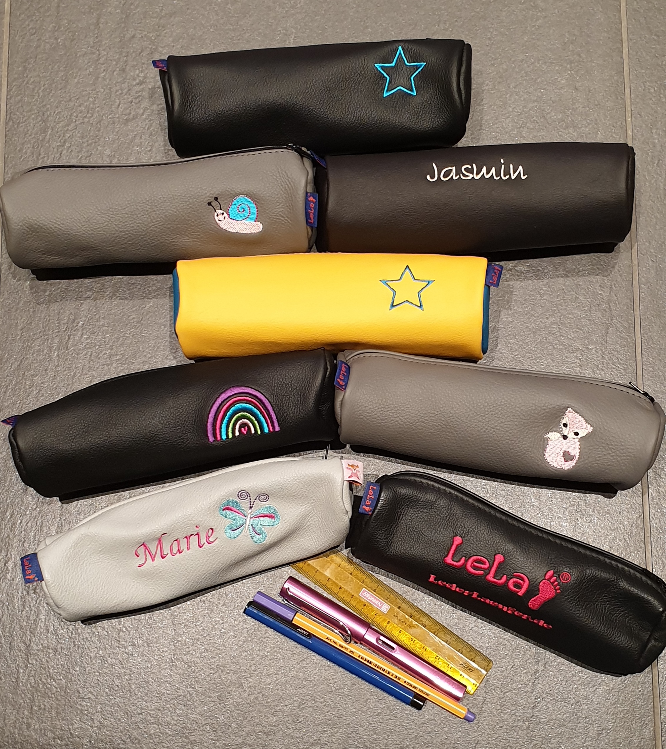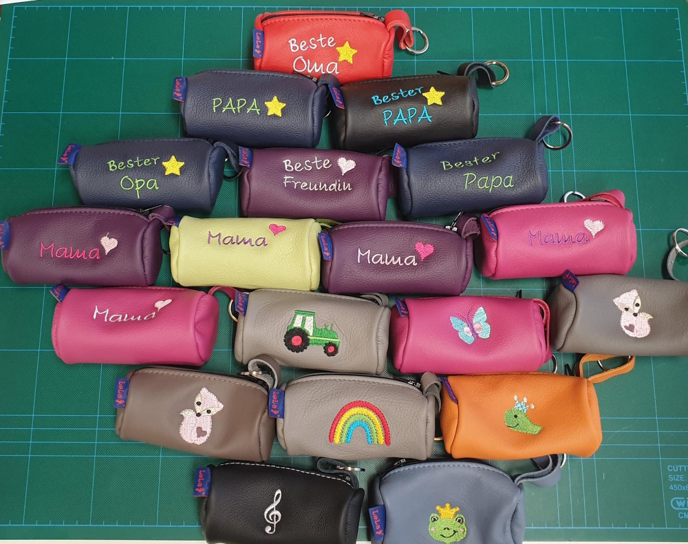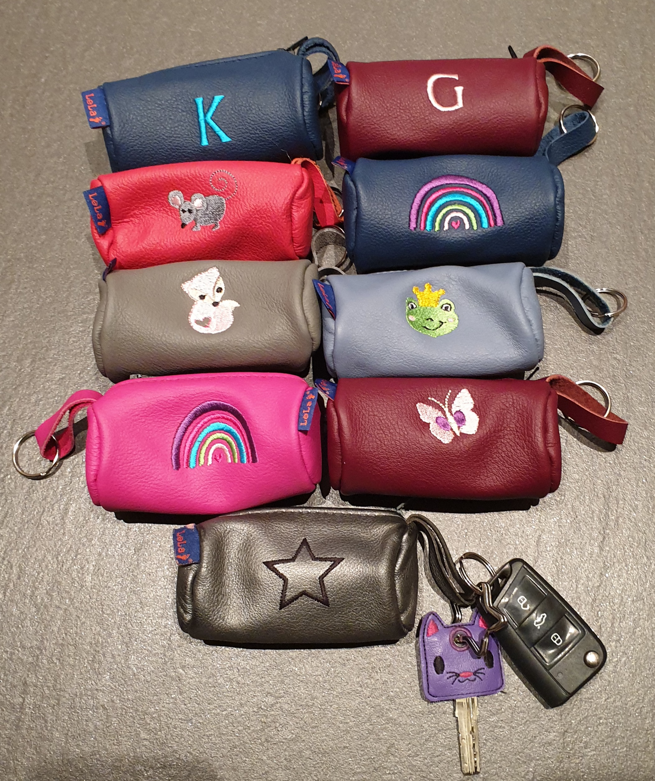 Exklusiv zugeschnittene Schlampermäppchen und Schlüsselmäppchen von LeLa. Und das Tolle daran: es wird mit Ihrem Wunschnamen oder einem Motiv bestickt! Das Schlampermäppchen ist ca 20 cm lang und kostet 17€, das praktische Schlüsselmappchen ist ca 8 cm lang und ist für 12€ zu haben. Beide haben einen Durchmesser von ungefähr 5 cm. | |